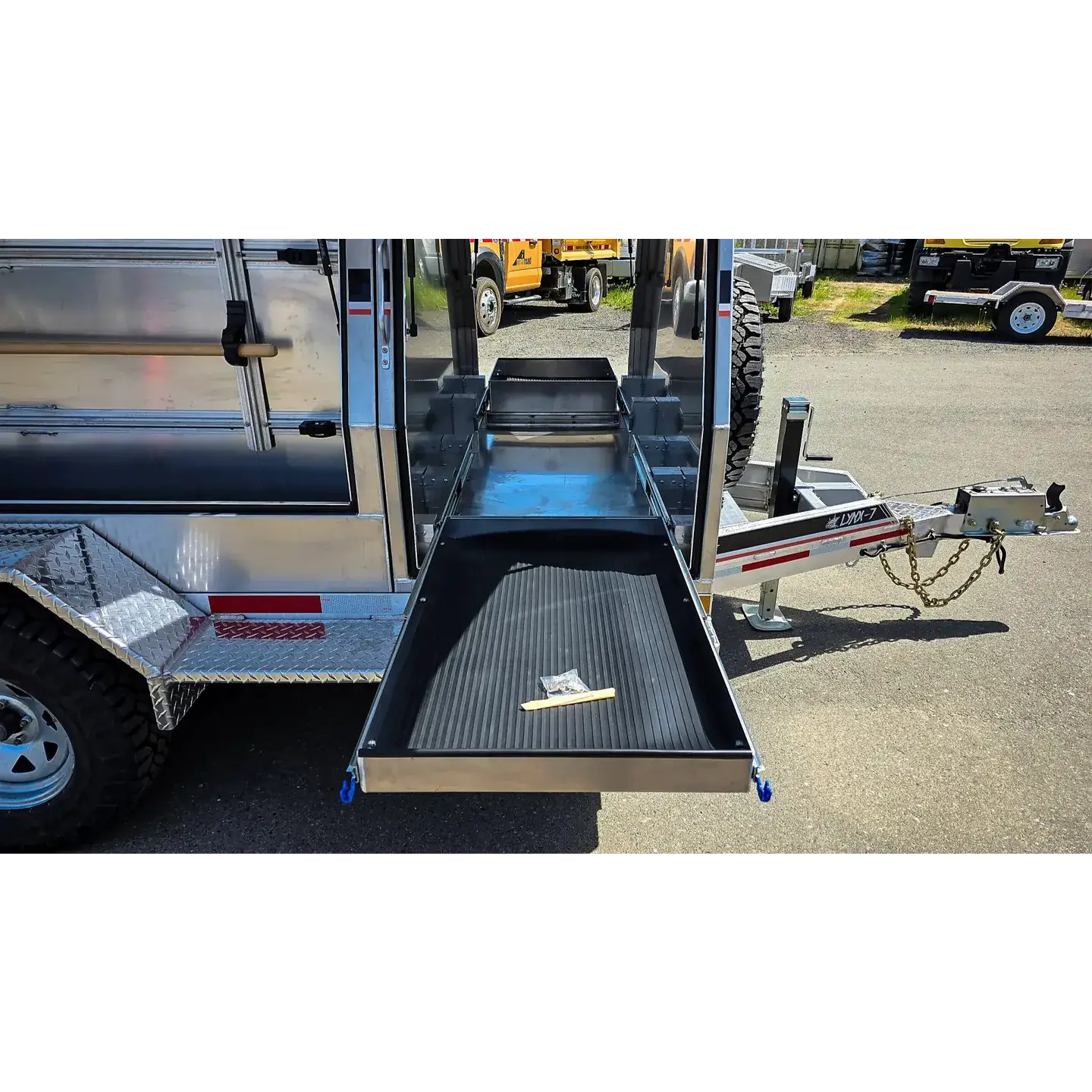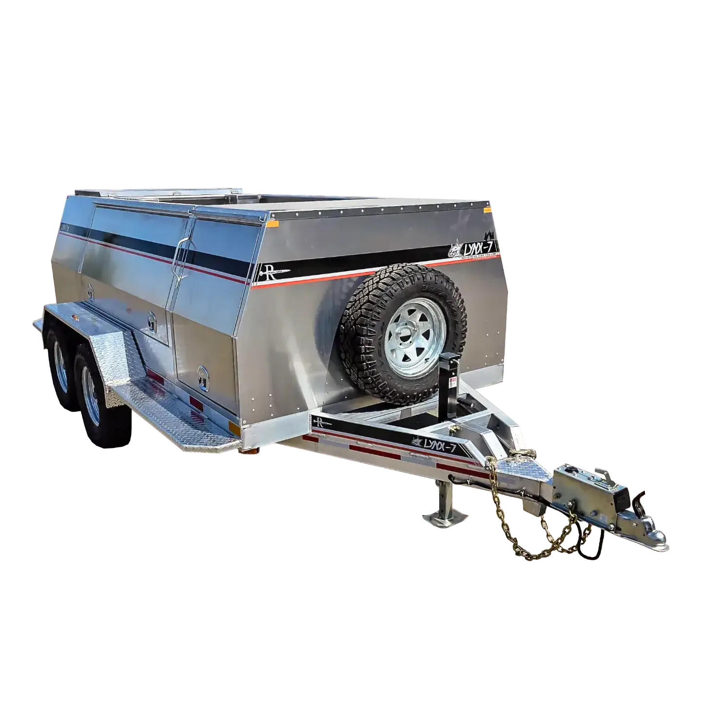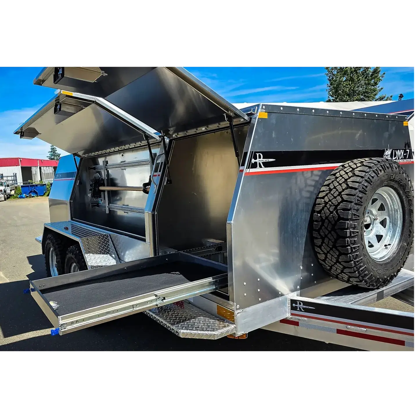 The Lynx 7 is a response-ready 6′ x 12′ wildfire-grade aluminum trailer. Equipped with surge brakes, no brake controller is required. Includes a 400US gallon (1,514L) water storage tank, and can be configured with the Vallfirest Black Hawk 4 or Black Panther 4 pumps. Finishes offered include powdercoat, paint, or decal/wrap finishes, however, bare aluminum looks great too.